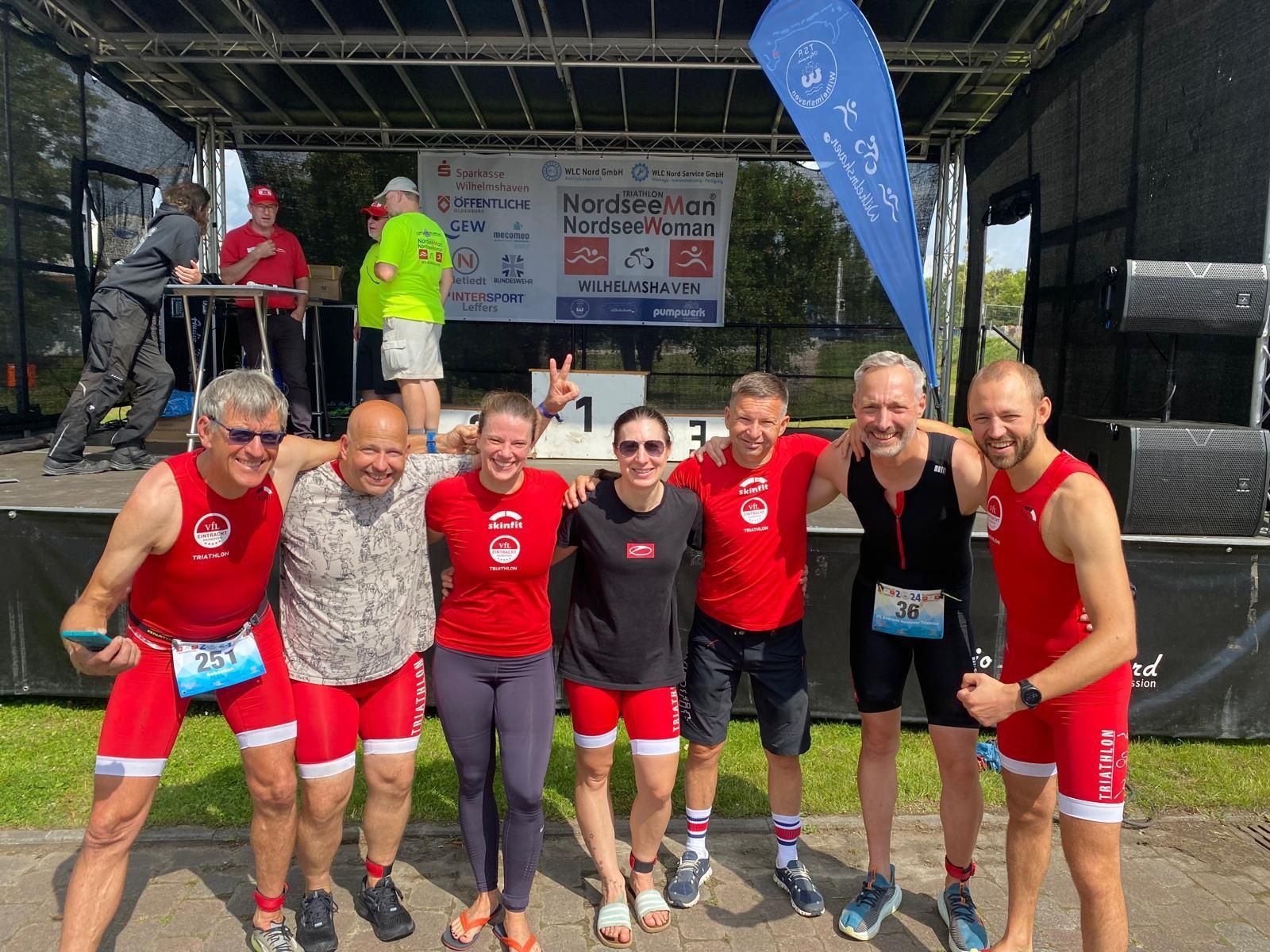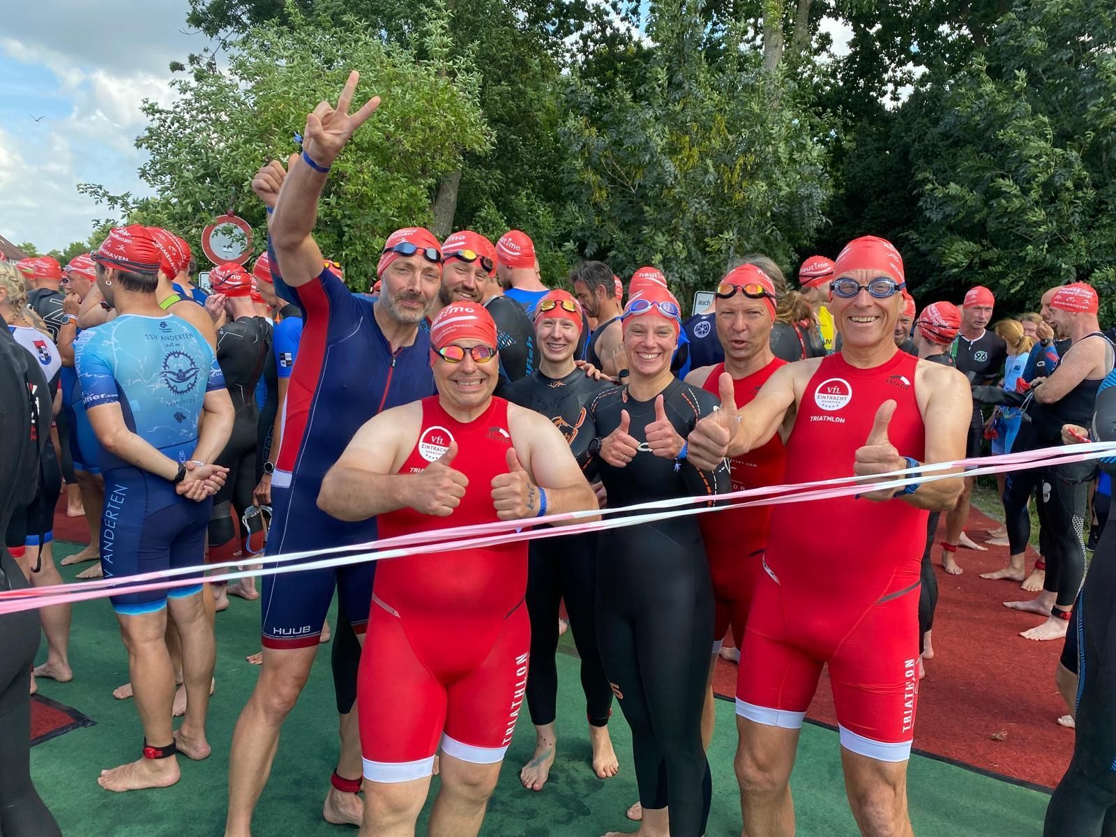 Nach einem zweiten Platz beim Verbandsliga-Saisonauftakt in Braunschweig und einem dritten Platz in Salzgitter mussten wir Triathlet*innen uns in Wilhelmshaven mit Platz 7 zufriedengeben. Hier in Wilhelmshaven ist das Rennen etwas anders. Zuerst geht es bei einem sog. Team Relay als Swim Run an den Start. Pro Mannschaft starteten vier Teilnehmer*innen als Staffel über 250 Meter Schwimmen und einen Kilometer Laufen. Die Gesamtzeit der Teams wurde gemessen. Der Abstand zwischen uns und dem ersten Team mussten wir dann beim anschließenden Sprint warten, bevor wir ins Wasser springen können.