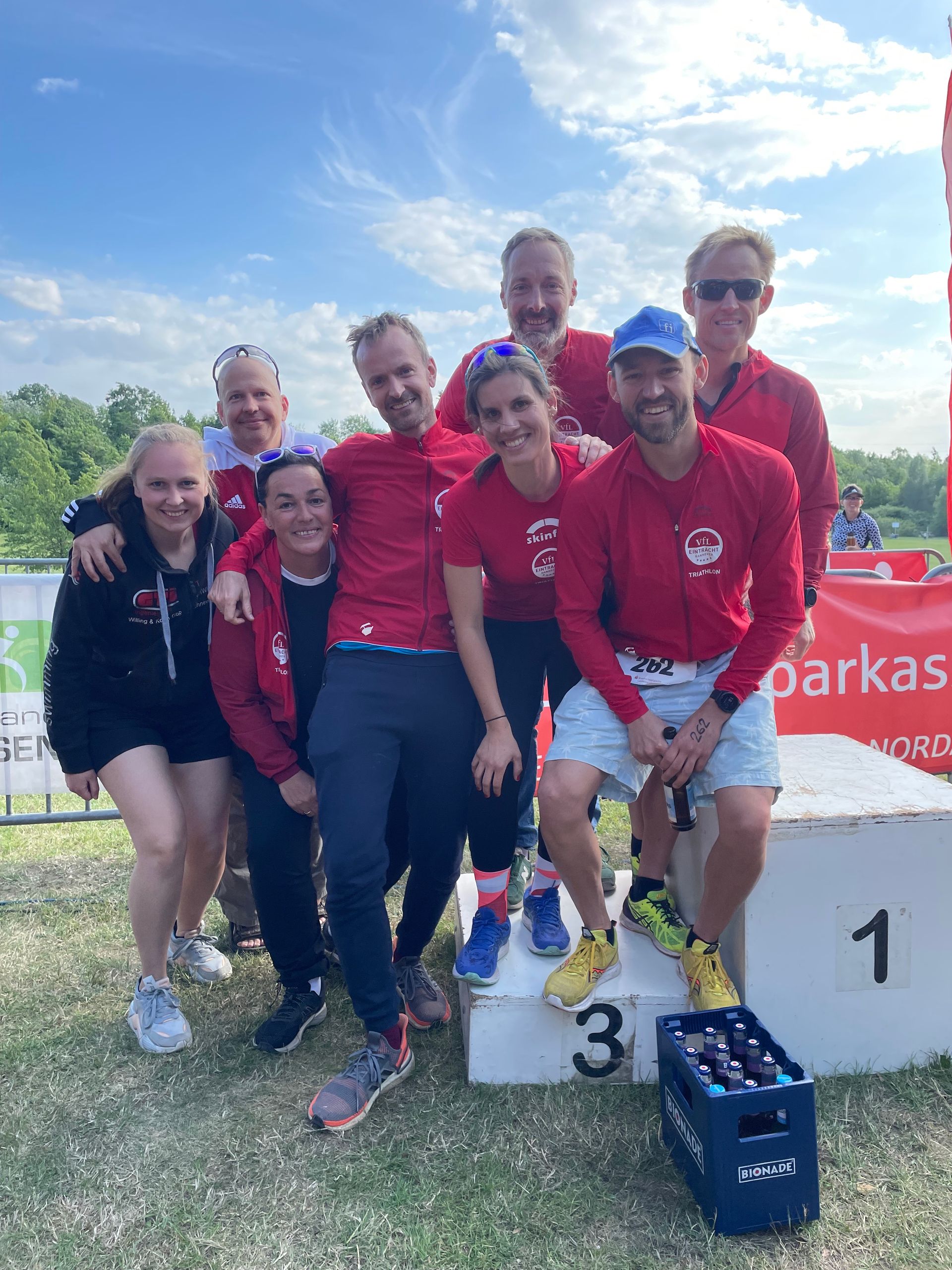Nach langem Warten war es am 02.07 Zeit für unseren 1. Triathlon in der Liga der 2023. WIr starten wieder gemeinsam in der Mixed-Liga. Heute sind 8 Personen dabei, um die neue Saison zu eröffnen. Aufgrund des starken Winds (Böen bs zu 65km/h) haben viele von uns vorher schonmal die Hochprofilfelgen gegen normale Felgen ausgetauscht. Los geht es mit dem Schwimmen. Das Wasser ist warm und so heißt es auf 2 x 375m für uns ohne Neo zu schwimmen. Schon hier machen sich die Wellen bemerkbar. Zwischen den Runden wartet ein Australian Exit. Auf dem Rad hieß es festhalten und durch. Vom Rad ging es dann auf die 2,5 km lange Runde, die ebenfalls 2. Mal absolviert werden musste. Am Ende feierten wir den 1. Platz von Nils gesamt, Prämiere für den VFL und unseren 3. Platz mit dem Team. Als Dank gab es auch einen kleinen Preis. Da es am Ende knapper als gedacht wurde, mussten wir uns den 3. Platz teilen. Ergebnisse Männer Nils Haug - 1:04:16 - 1. Platz gesamt Marco Hohlen - 1:06:18 - 5. M, 1. AK Matthias Debarry - 1:14:30 - 31. M, 3. AK Konstantin Osterwald - 1:15:28 - 32. M, 12. AK Thomas Müller - 1:15:39 - 34. M, 2. AK Frauen Barbara Meyer 1:17:10 - 6. W, 3. AK Kira Behrens 1:28:44 - 19. W, 3. AK Anne Kathrin 1:35:01 - 25. W, 3. AK